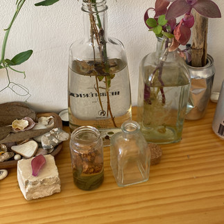 I started gathering more elements — bamboo, delicate and tall. Glass smoothed by the sea, still holding the rhythm of the tides. A piece of cork soaked in citrus alcohol, its scent gently opening something in me.